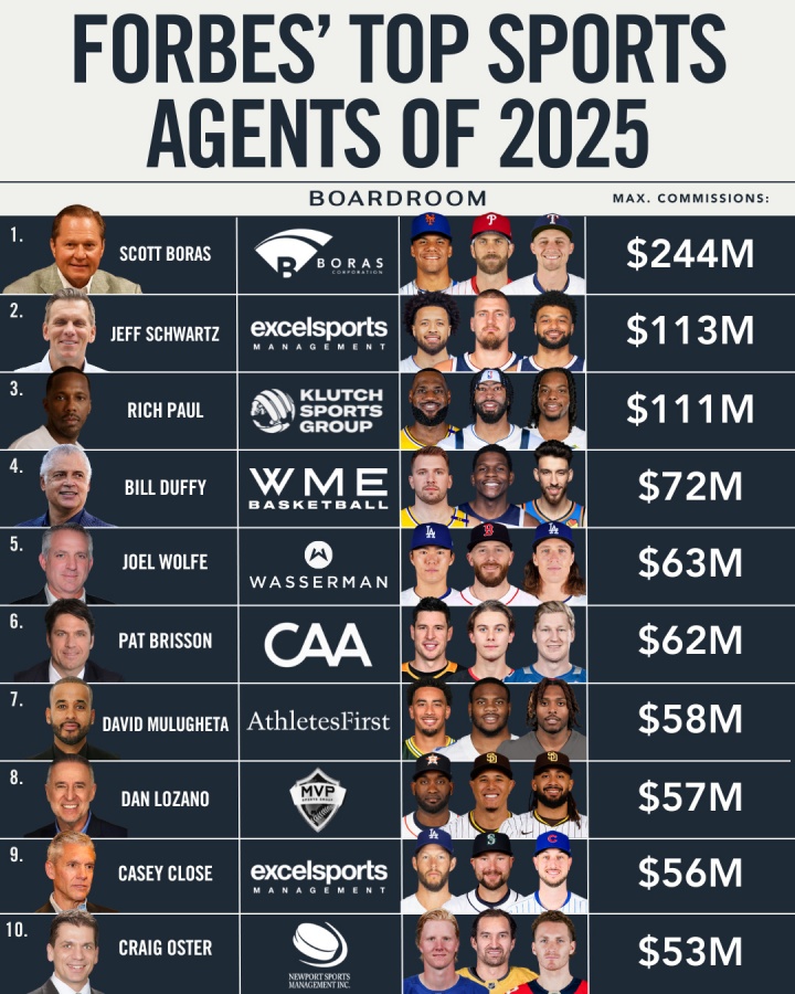 体育经纪人25年佣金排行:MLB传奇登顶2.44亿,富保罗屈居季军